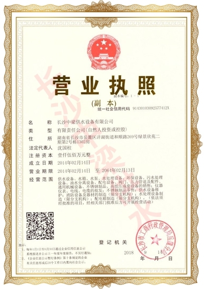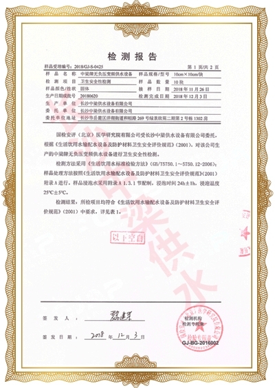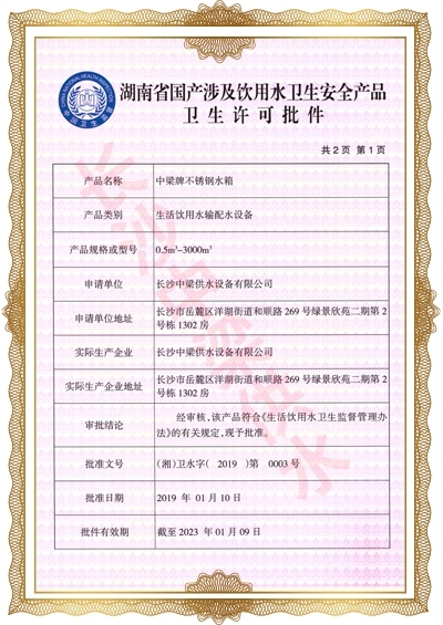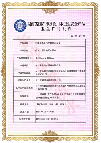 長沙中梁供水設備有限公司已先后通過湖南省衛(wèi)生廳國產涉及飲用水衛(wèi)生產品衛(wèi)生許可批準;